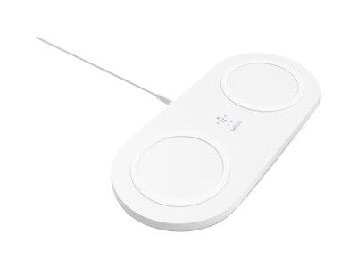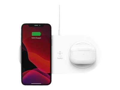 Belkin BoostCharge Dual - Langaton latausalusta + AC-virtasovitin - 15 watti(a) - valkoinen malleihin Apple iPhone 11, 11 Pro, 11 Pro Max, 8, 8 Plus, X, XR, XS, XS Max; Samsung Galaxy Note10, Note10+, S10, S10+, S10e