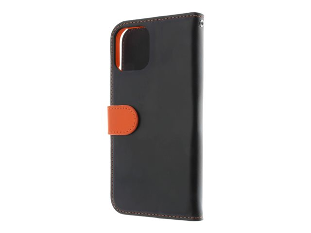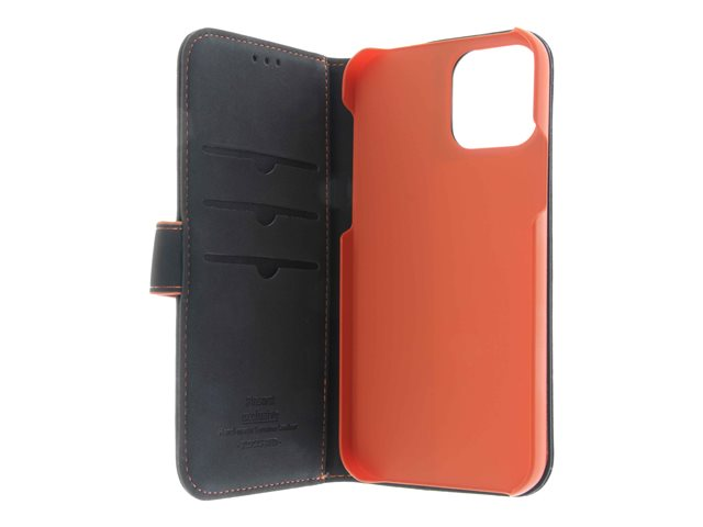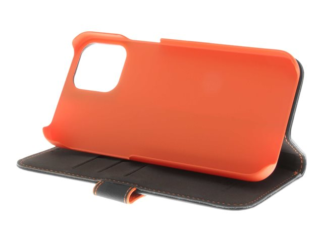 Insmat - Läppäkansi matkapuhelimelle - aito nahka, paperi, polykarbonaatti, kartonki, polyuretaanipehmuste - musta, oranssi malleihin Apple iPhone 12, 12 Pro 650-2969
